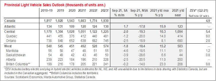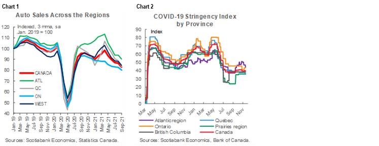 - Lagging provincial auto sales data confirm that inventory shortages curbed sales across most of the country in September. It also provides a reminder that caution is warranted (for economists at least) in relying on single-source monthly data points for auto sales in Canada given a wide range of estimates across sources (admittedly, each with a different methodology). DesRosiers Automotive Consultants Inc. had reported a -4.3% m/m (sa) decline in national auto sales for September; Wards Automotive tabulated a +1.2% m/m (sa) improvement, while recent Statistics Canada data falls somewhere in between with a -2.1% m/m (sa) dip for the month of September.
