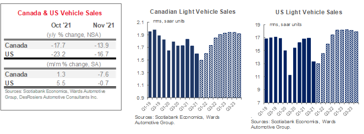 Canadian auto sales dipped in November in what has been a volatile recovery for auto sales amidst inventory challenges. DesRosiers Automotive Consultants Inc. estimated 110 k vehicles were sold at a seasonally adjusted annualised rate of just 1.45 mn units (-13.9% y/y). This works out to a -7.6% m/m (sa) decline, following October’s modest gain (1.3% m/m, sa). Recall, some monthly variability can be discounted as the shift to quarterly reporting in Canada has introduced wider margins of error. The recovery in North American auto production in November (+9% m/m, sa) offers measured hope that output will continue to improve into next year, but a host of headwinds will likely slow the pace. As Canada competes for limited inventory, days supply continues to edge lower across Canada, clearly constraining sales in an otherwise robust demand environment. Job growth may have stalled in November when numbers are published as rebound effects wane (and government programs were wound down), but the hand-off from October was strong with jobs exceeding pre-pandemic levels and robust wage gains over the past four months. Retail sales (and guidance) have surprised on the upside so far this Fall, despite supply-side constraints. Elevated household savings and still-hesitant consumer confidence suggest there is still more spending to be unwound as the economic recovery advances—and importantly when supply is available. The acute supply-demand imbalance continues to drive new vehicle price inflation: 6.1% y/y in September CPI (0.3% m/m, nsa). Our sales forecast sits at 1.67 mn, 1.77 mn, and 1.93 mn units in 2021, 2022, and 2023, respectively. While fundamental economic drivers suggest auto demand should be approaching pre-pandemic levels, auto production capacity likely limits the pace at which supply can meet this pent-up demand; consequently our projections close that gap only by 2023. There is still high uncertainty on this outlook including around the pace of auto production recovery. The emergence of the Omicron variant poses another material risk through further global supply chain disruptions while, domestically, recent weather events in British Columbia could temporarily impact the Canadian auto sector through port and rail turmoil.