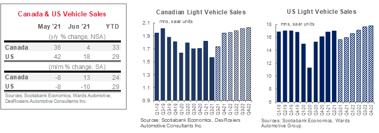 Canadian auto sales posted only a weak rebound in June with the reopening of provincial economies as low inventory curbed purchases. DesRosiers Automotive Consultants Inc. estimates 163 k vehicles were sold—a 4% improvement relative to last year but still 12% down relative to June 2019. On a seasonally adjusted basis, sales posted an approximate 13% m/m improvement relative to May when most of the country was under lockdown, but the selling rate stood at a modest 1.65 mn saar units. This brought second quarter sales down sharply by 14% q/q (sa) following first quarter growth of 5% q/q (sa) at a solid sales rate of 1.82 mn saar units. Weak Canadian sales activity in April and May can largely be attributed to lockdowns as south-of-the-border purchases were relatively robust in early Spring despite ongoing inventory shortages. However, notwithstanding strong demand—evidenced by high price appreciation in both new and used vehicle markets—empty dealer lots likely curbed any substantial rebound in June. Inventory levels remain at historic lows as the global semiconductor chip shortage has seriously impacted North American vehicle production. While vehicle production has stabilized in June, it is only expected to start accelerating in August, according to Wards Automotive Group. But this may already be dated with Ford recently announcing further production cuts in July in a rapidly evolving environment. Otherwise, consumer health remains robust: a temporary dip in jobs under the lockdown likely saw a turn-around in June; already-elevated household savings ticked up modestly again in the first quarter (to 13%); and major purchase intentions have largely stabilized, apart from slight deteriorations under each lockdown. Rapid progress on vaccine roll-out should accelerate both confidence and consumption going forward…provided there is product to purchase. In our baseline forecast, we expect auto production to accelerate over the third and fourth quarters. Pent-up demand for new vehicles should unwind progressively to finish the year at 1.75 mn units. There is substantial downside to this outlook given the uncertainty around supply constraints, as well as competition for limited vehicles against robust American demand.