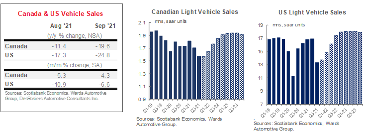 Canadian auto sales pulled back sharply again in September as limited inventory restrained purchases. DesRosiers Automotive Consultants Inc. estimated 137 k vehicles were sold for a -19.6% decline relative to last September. On a month-over-month basis, sales slowed by -4.3% at a seasonally adjusted annualised sales rate of 1.55 mn units according to the same source. As discussed in greater depth here, supply is by far the dominating factor behind weak auto sales globally. Canadian dealers started the month with empty lots as days supply sat at record-lows at the end of August, with particularly acute shortages in Ontario and Quebec. The situation is not expected to improve in the near term as North American auto production decelerated again in August by -12% m/m (sa) and almost all major auto producers announced further curtailments to near-term production plans over the course of September. Covid-19 outbreaks in South Asia have further disrupted semiconductor chip supply and are expected to continue to weigh on auto production over the next couple of months at least. Otherwise, fundamental demand-side factors remain largely intact with July data (latest available) beating expectations across the board from job growth, to retail sales, to GDP, and August guidance looks positive. Consumer confidence has weakened over August and September—not surprisingly—as fourth waves unfolded across many parts of the country in a consistent ebb-and-flow pattern we have seen with each wave of COVID-19. The acute supply-demand imbalance continues to drive new vehicle price inflation: +0.5% m/m and 7.7% y/y in August CPI. We have nudged down our sales forecast to 1.67 mn units and 1.80 mn units in 2021 and 2022, respectively. While shortages will fuel pent-up demand, production capacity likely limits the ability to fully unwind this over the course of 2022. We consequently expect to see continued growth in 2023 at 1.93 mn units.