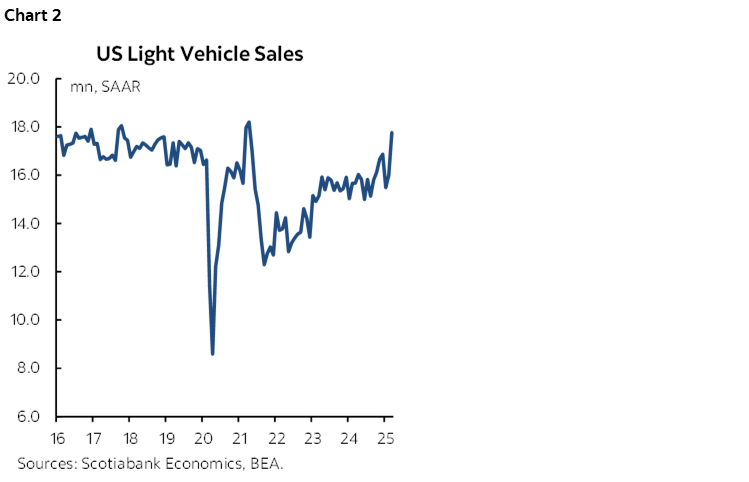 Auto sales’ strong start to the year could be driven at least partially by sales pulled forward from consumers that may have been looking to front-run tariff disruptions, notably from the surge in March. The US had been threatening to impose tariffs on some imported Canadian goods since late-January, with some tariffs coming into effect in early March, and it was announced on March 26th that additional tariffs would directly target the automotive sector.