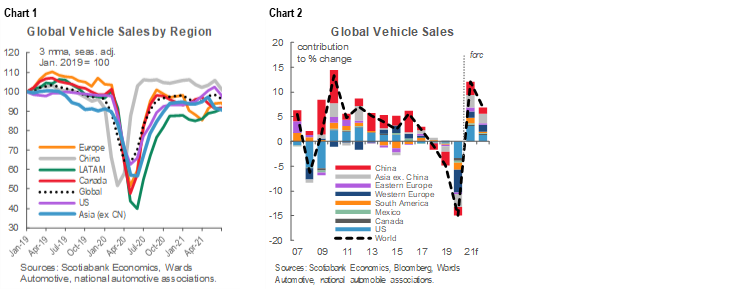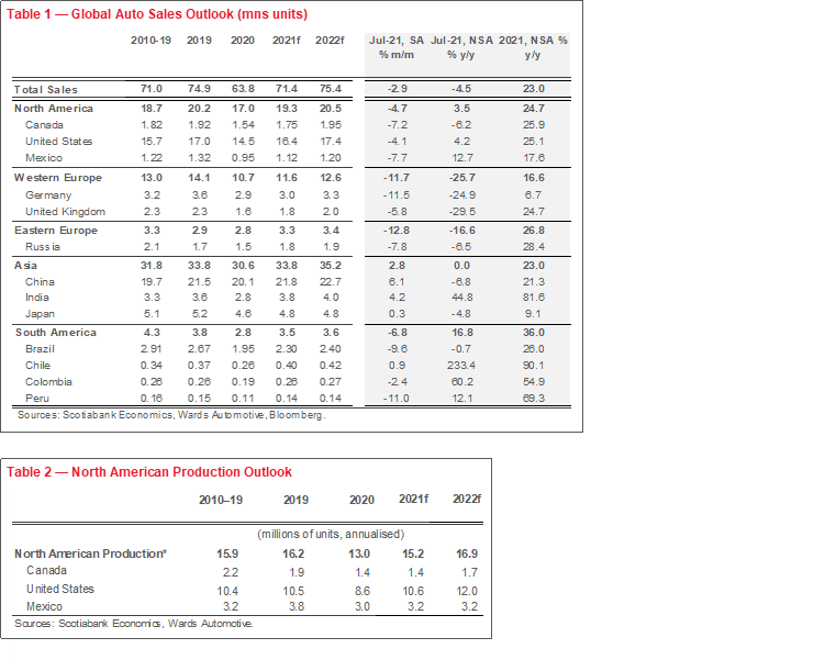 The impact has been particularly biting for North American markets where an exceptionally strong rebound in US demand has outstripped supply. After surging sales earlier in the spring, US auto sales pulled back in July by -4% m/m (sa) for a third month in a row, albeit with some deceleration relative to the -10% m/m retrenchment in June. Sales were a mere 14.7 mn units on an annualized basis in July—or a full 10% below the 16.5 mn mark they had been trending in the first half of the year. (See more details for US and Canadian July sales here.) Industry guidance suggests another decline is in the cards for August sales.