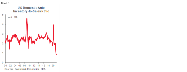 It is reasonable to expect more production cuts will be announced by other auto manufacturers in September as the Delta variant persists. This would delay the recovery in retail inventory levels, already at all-time lows. Days supply stood at 24 days heading into August in the US (with a normal range being 60–65 days), while inventory (as a share of sales) sat below 1 again in July (chart 3). Even though US vehicle sales will likely retreat further in August, a higher-than-anticipated contraction in production would put more downward pressure on inventory levels heading into September.