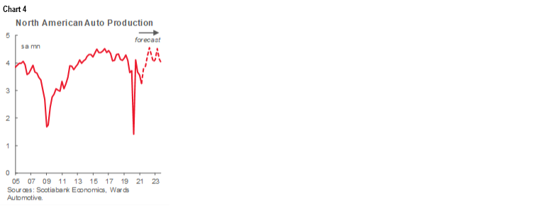 A recovery in production later in the fall is still in baselines, but conviction is highly tenuous. The forecasted third-quarter rebound of 15% q/q (sa) in North American auto production by Wards is more of a place-holder pending further announcements from manufacturers that would push out the recovery (chart 4). As elaborated in last month’s report, we do not expect a more balanced supply-demand market until well-into 2022 for new vehicles and even later for used vehicles.