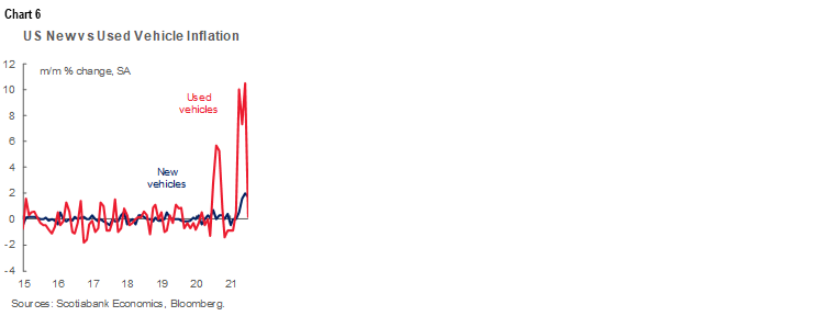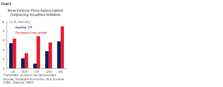 It is premature to expect softening in new vehicle prices until inventory bottlenecks are resolved. According to J.D. Power, average transaction prices for new vehicles in the US were tracking at an all time-high of over USD41K—nearly 17% higher than July 2020—and 3% m/m higher than June 2021. This translated into a +1.7% m/m increase in new vehicle price inflation as measured by the US Consumer Price Index in July. This is trending globally with similar patterns across developed and emerging markets alike; for example, new vehicle price inflation approaching 10% y/y in Mexico in July (chart 5).