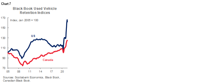 Wholesale vehicle prices have been moderating faster than retail prices. Over the course of July, Black Book reported softening weekly price appreciation in wholesale prices in the US and Canada as potential buyers backed away from high prices and limited inventory—though potentially the calibre of supply may also be deteriorating as older and/or higher wear-and-tear vehicles are entering the market. Vehicle retention indices, which aim for comparability, also finally pulled back in July, according to Black Book, after months of skyward escalation (chart 7).