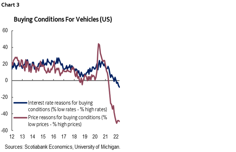 US May sales contracted by -12.5% m/m (sa) while the auto sector braces for rising interest rates and deteriorating affordability. The year-to-date purchases stood at a meagre 13.9 mn saar units, well below the 17 mn saar units that was trending in 2019 and the first half of 2021. A series of events in May might have side-tracked auto sales recovery in the US through consumer sentiment, most notably the Federal Reserve delivering a 50 bps hike in early May (followed by another 75 bps in mid-June), which has driven new car loan rates to around one percentage point higher than at the beginning of this year. Vehicle price increases substantially outpaced income growth—as estimated by Cox Automotive, the number of median weeks of income needed to purchase a new vehicle in the US reached 41.3 weeks in May, compared to around 35 weeks a year ago. Rising interest rates, coupled with eroding affordability, have created some hesitation among the American consumers on car purchase decisions, according to the University of Michigan's Surveys of Consumers (chart 3).