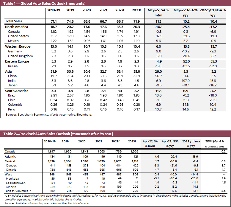 Even with some erosion of fundamental demand for new vehicle purchases in Canada, a variety of factors should underpin our sales outlook. For one, pent-up demand has been growing for almost two years now with persistent inventory shortages eroding sales. Exceptionally tight labour markets and wage pressures also bode well for consumer activity in our baseline. (See here for details on Scotiabank Economics’ latest economic outlook including baseline assumptions.)