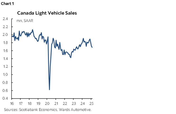 Canadian auto sales in February fell by -1.7% month-over-month to 1.69 mn units at a seasonally adjusted annualized rate (SAAR) according to Wards Automotive (chart 1).