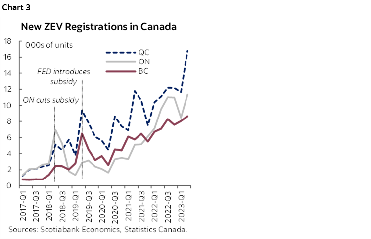 There is still lots of progress to be made towards meeting Canada’s Zero-Emission Vehicle (ZEV) sales targets. Recent sales of electric vehicles (EVs) in Canada as a share of all new motor vehicle registrations have held steady, accounting for 8.6% in Q2 and H1 of 2023, almost unchanged from Q3 2022 (8.7%). Canada’s first interim sales target is at least 20% of new light duty vehicles being ZEVs by 2026 and is a step towards 100% ZEV sales by 2035. In order to meet this first interim target, EV sales would need to more than double from the amount registered in the four quarters ending Q2 2023, when holding total sales unchanged. In Ontario, Canada’s largest provincial market by total vehicle sales, only 6.2% of new motor vehicle registrations were EVs, despite accounting for over one in four (28.2%) of national EV sales (chart 3). By contrast, slightly more than two in five (41.7%) new EVs were registered in Quebec, the second largest market by volume, making up 14.7% of total new vehicles in the province. Meanwhile one in five (21.5%) of all new EVs were registered in B.C., accounting for 15.2% of new motor vehicles registered in the province, resulting in B.C. being the province reporting the closest share to meeting Canada’s first interim sales target. Vehicle affordability will likely continue to pose a headwind towards EV sales in Canada in the near term, but risks being a major constraint as discussed in a recent report by Scotiabank Economics. While elevated financing rates are likely to pose headwinds to EV sales in the near term, a continuation of the status quo producing vehicles consumers want today may limit affordability and adds risk to meeting Canada’s 100% ZEV sales targets little more than a decade from now.