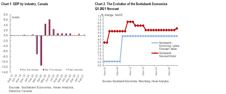 In contrast, the preliminary assessment of the Canadian GDP growth in February (+0.5% m/m) surprised to the upside, leaving the full-quarter’s GDP growth estimate higher at +5.67% Q/Q SAAR. According to Statistics Canada, growth in February was driven by the re-opening of the retail sector, the booming construction industry and the red-hot Canadian real estate market. A pullback in manufacturing provided an offset, as the sector struggled amidst parts shortages in February.