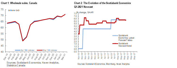- Two data releases today showed that the Canadian economy likely grew significantly in March, with both manufacturing shipments and wholesale sales rebounding after their respective declines in February. With the latest data release, the overall GDP outlook for Q1-2021 is roughly unchanged, at +6.21% Q/Q SAAR.