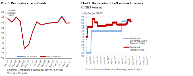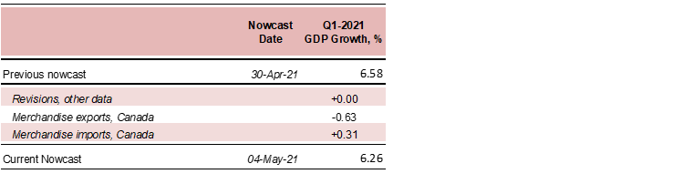 - Canadian merchandise trade release for March continued a pattern of significant volatility as a string of special factors and rolling lockdowns affected trade shipments over the past few months. A large rebound in the dollar value of exports seen in January gave way to a large decline in February and a relatively flat March (+0.3% m/m), while imports surged (+5.5% m/m) in March. Overall the release leaves the contribution from net exports in Q1-2021 weaker than previously expected by the model, with the nowcast edging down to 6.26% Q/Q SAAR.