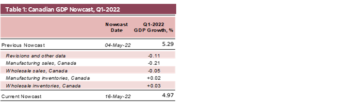 - Today’s double-feature from Statistics Canada sowed some doubts about the durability of the Canadian economic growth, with disappointing manufacturing and wholesale sales for March. The two releases showed relatively weak growth after stripping out strong price increases, which might be a reflection of economic conditions more broadly. As a result, the estimate of the overall GDP growth in Q1-2022 slid to +4.97% Q/Q SAAR, still a strong increase despite the setbacks.