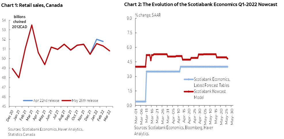 - This morning, StatCan published its estimate of the Canadian retail sales in March, completing the run of major macroeconomic releases for Q1-2022. Sales in March were virtually unchanged, which was a disappointment compared to StatCan’s early estimate of +1.4% m/m growth. However, the negative surprise was fully explained by the decline in motor vehicles and parts (-6.4% m/m), with the remaining 10 sectors growing briskly. In volume terms, the overall sales in March were down -1.0% m/m, again on a pullback in motor vehicles and parts. As a result the nowcast for the Canadian GDP growth in Q1-2022 eased to +4.84% Q/Q SAAR.