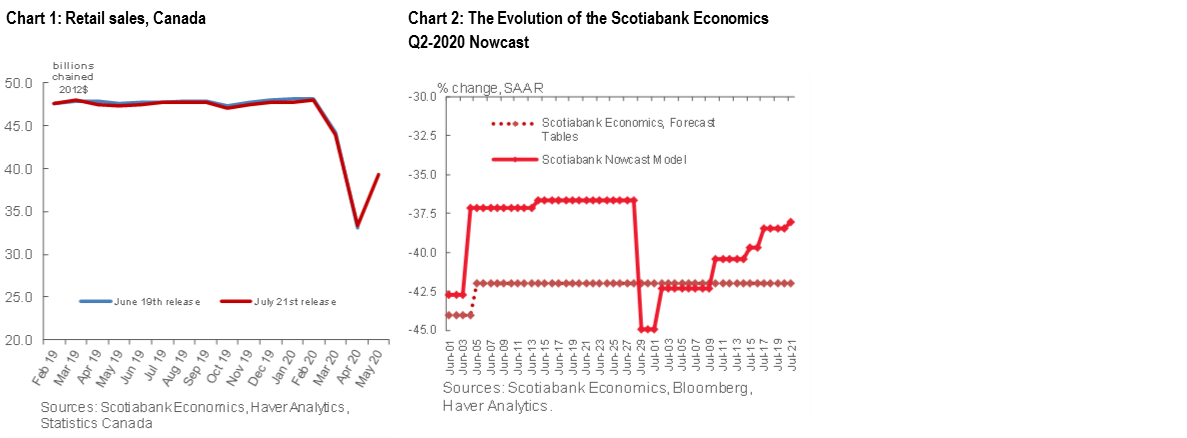 Retail sales rounded out the main suite of data releases from Statistics Canada for May. It was a strong print, with overall retail sales up by 17.8% m/m in May, when measured in chained 2012 dollars, leaving sales 18% below the February level. Thus, as of May, real retail sales recouped 40% of the total decline that the sector suffered in March–April in the depth of the pandemic, despite 23% of retailers remaining closed in May.