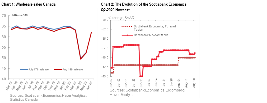 Wholesale sales rebounded in June (+18.5% m/m) to a level that was less than 4% below that of February, pointing to a continued recovery in the Canadian economy from the pandemic-induced shutdowns in April and early May. As a result, the Q2-2020 GDP nowcast strengthens slightly, to -38.74% Q/Q SAAR, a touch stronger than the flash estimate from Statistics Canada of GDP declining about -40% Q/Q SAAR.