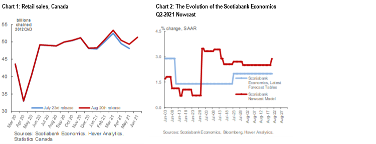- Canadian retail sales roared back in June as pandemic-related restrictions were relaxed across provinces, growing +4.2% m/m in nominal terms and in line with expectations (volumes: +4.1% m/m). What is more, the volume of retail spending was revised substantially higher over the previous few months, leaving the level in May 2.4% higher than the previous estimate (chart 1). The upward revision to retail sales, as well as stronger-than-expected data received earlier (manufacturing and wholesale sales, as well as merchandise trade) leave the estimate of Q2-2021 GDP growth in Canada at +2.88% Q/Q SAAR.
