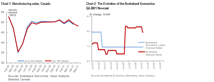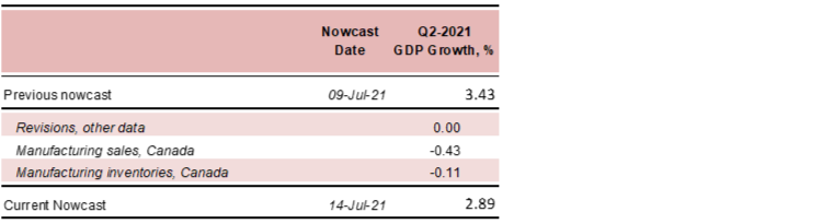 - Despite early estimates suggesting that Canadian manufacturing sales rose 1.0% m/m in May, the final print showed that not only did sales not increase, they in fact declined by -0.6% m/m. The fall in volumes was even worse (-2.5% m/m). The weaker-than-expected output in the manufacturing industry led to a downward revision of the Q2-2021 GDP growth nowcast to 2.89% Q/Q SAAR.