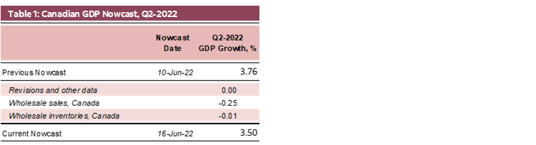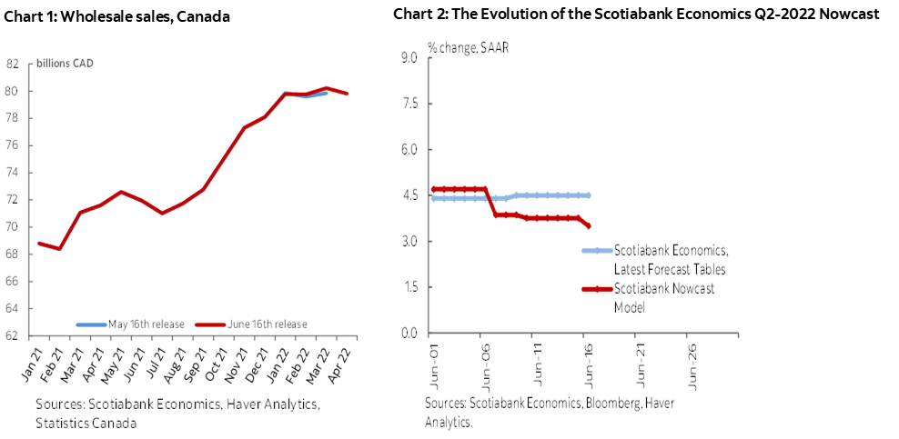 - Following the Canadian manufacturing sales release on Tuesday, Statistics Canada published its estimate for wholesale sales in April, showing continued lack of momentum in the sector with sales down –0.5% m/m (volumes down –0.6% m/m). This was weaker than the early estimate released at the end of May (+0.2% m/m), leaving the GDP nowcast for Q2-2022 lower at +3.5% Q/Q SAAR.