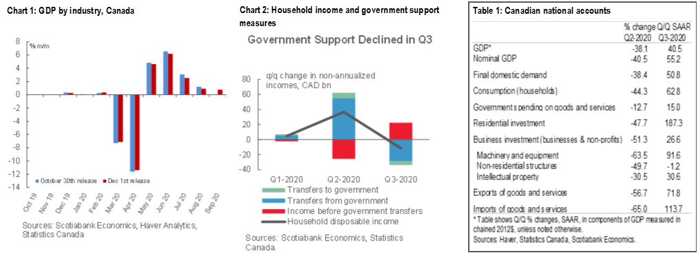Canadian GDP expanded at the rate of 40.5% Q/Q SAAR in Q3-2020, the highest on record, as the Canadian economy bounced back from the pandemic-related lockdowns in Q2-2020. The Q3-2020 expansion was weaker than expected, however, compared to the latest nowcast of 47.87% and the preliminary flash estimate of above 46% growth from Statistics Canada, the latter released at the end of October. The latest data show that the contraction in Q1-Q2 was more shallow than previously reported, which explains the weaker rebound and leaves the level of GDP in Q3-2020 only slightly lower (-0.2%) than previously expected.