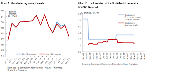 - September proved to be another tough month for the Canadian manufacturers, as overall sales slid by -3.0% m/m (slightly better than the initial estimate of -3.2% m/m from Statistics Canada). However, when price changes are stripped out the volumes were down by -4.2% m/m. The weaker-than-expected volume of sales in September explains a downgrade to the Q3-2021 Canadian GDP nowcast to +1.94% Q/Q SAAR.