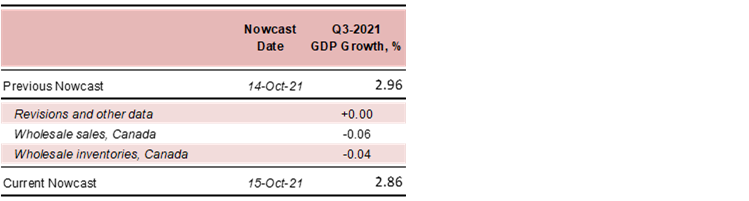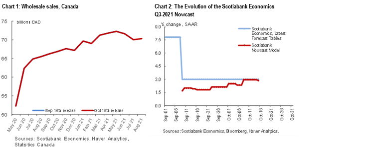 - Canadian wholesale sales were slightly weaker than expected in August, growing by +0.3% m/m compared to a +0.5% early estimate from Statistics Canada, resulting in a slight easing in the GDP nowcast for Q3-2021 to +2.86% Q/Q SAAR.