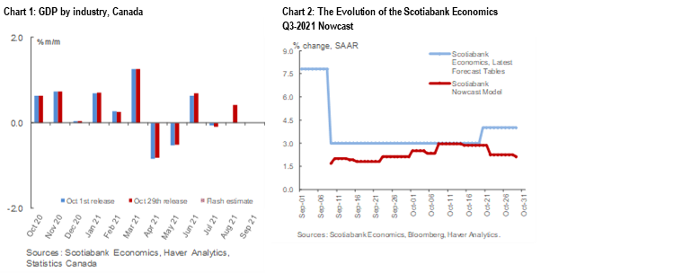 - Canadian industry-level GDP growth of +0.4% m/m in August was relatively in line with the nowcast. However, this was weaker than the initial estimate from StatCan (+0.7% m/m), and once the flat early September GDP estimate is taken into account, the industry-level output is now seen expanding by +2.13% Q/Q SAAR over Q3-2021.