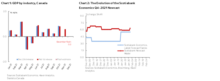 - Overall growth in Q4-2021 was likely very strong, currently estimated at +6.33% Q/Q SAAR, with caveats around the risk of revisions and a possible downside risk in December on the rapid spread of the Omicron variant. However, January is likely to be hit hard by the public health restrictions and absenteeism, before the re-openings and the ebbing of the Omicron wave set up a rebound in growth later in Q1-2022.