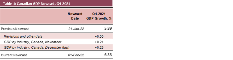 - Statistics Canada released its estimate of GDP growth in November 2021 this morning, and it turned out the economy was stronger than we and Statistics Canada expected. Monthly expansion of +0.6% m/m was seen in the Canadian GDP, compared to the early estimate of +0.3% m/m published a month ago by StatCan. The surprise was less significant for the nowcast, as the string of positive data released in January boosted the estimate of growth in November beyond StatCan’s flash number. Including an early estimate for GDP growth in December (flat) released this morning, the overall Q4-2021 GDP nowcast moves up to +6.33% Q/Q SAAR.