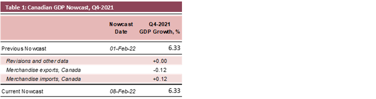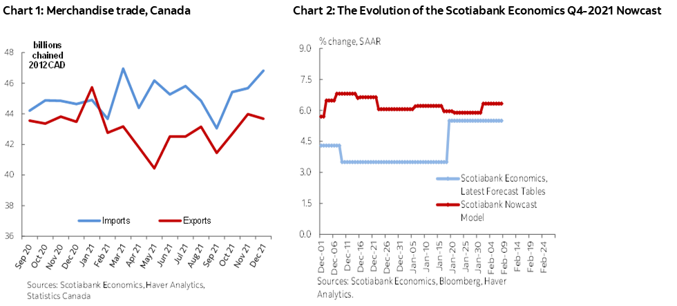 - Weak exports and strong imports were neutral in terms of the impact on the estimate of the Q4-2021 GDP growth in Canada, which remained at +6.33% Q/Q SAAR.