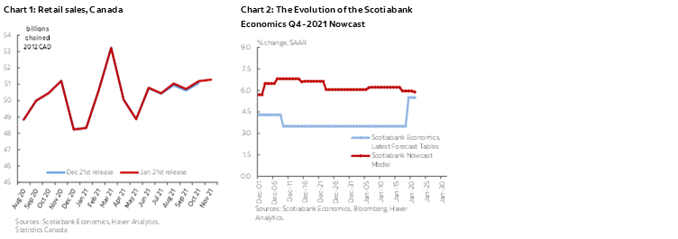 - While the estimate of growth in Q4-2021 remains robust, although subject to significant risks to the upside and downside, the deterioration in growth towards the end of the quarter gives a poor hand-off for Q1-2022, on top of a significant hit to activity expected in January with the re-introduction of public health restrictions in various provinces and increased absenteeism. The good news is that this weakness should be temporary: as the Omicron wave ebbs, the economy will get back to work.