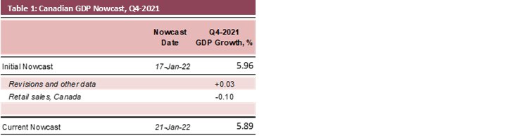 - Rounding out major releases for November, the Canadian retail sales print came out with a double dose of disappointment: sales growth was even more tepid than previously expected, at +0.7% m/m compared to the preliminary estimate of +1.2% m/m. The rapid increase in consumer prices meant that the volume of sales was almost flat m/m at +0.2%. In addition, preliminary data suggests that retail sales weakened substantially in December (-2.1% m/m), mirroring the experience south of the border. Overall, the marginally weaker-than-expected retail print drove the Q4-2021 Canadian GDP nowcast down to +5.89% Q/Q SAAR.