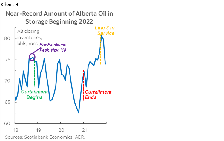 For WCS, we expect the discount to WTI to hover between 14.50 and 15 USD/bbl in 2022. This year, rising Canadian output and a high number of barrels in storage (chart 3) should contribute to looser market balances, and we begin 2022 with seasonally weak USGC refinery activity. As more OPEC+ barrels are pumped, that should also increase the availability of heavy sour crude in the USGC, thereby reducing Canadian barrels’ recent competitive advantage. The good news is that we expect these forces to be roughly offset by new Canadian pipeline egress capacity in the form of the now operational Line 3 conduit. The completion of TMX—which we anticipate in H1-2023—should add further support over the longer-run.