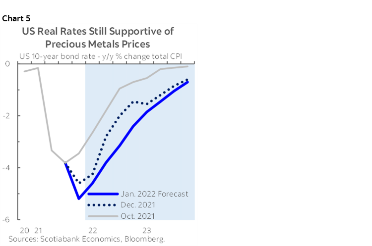 With interest rate hikes now expected to come earlier and more often this year, we have lowered our gold and silver price forecasts incrementally. For bullion, we now project an annual average of 1,800 USD/oz—$50/oz lower than previously—with silver’s 2022 mean revised 0.50 USD/oz lower to 24.50 USD/oz. Despite the downgrade, our projection for gold in 2022 would still be the highest annual average price since at least 1988. Given the acceleration in inflation, the rate environment remains very accommodative despite our more hawkish shift—our forecast is consistent with negative real US 10-year rates through 2023 (chart 5). Market uncertainty should also remain elevated albeit easing as we continue to grapple with COVID-19, which supports the attractiveness of precious metals as safe haven assets.