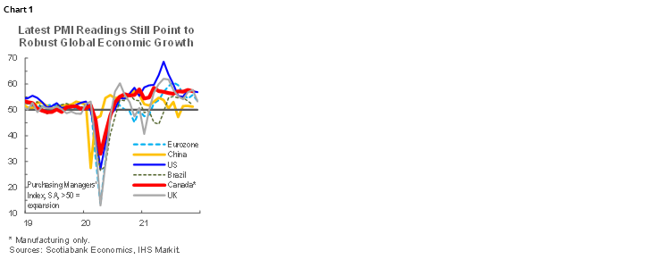 Economic growth remains robust around much of the world as the global economy continues to reopen and recover from COVID-19 (chart 1), and that is still contributing to supply-demand imbalances and broad price pressures. Inflation readings continued to breach multi-decade highs this past month.