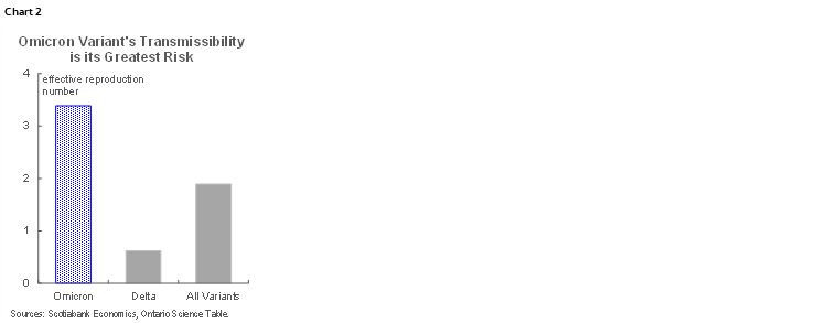 Our outlook incorporates a small negative growth impact this quarter and next related to the newly discovered Omicron variant of COVID-19. That effect largely reflected the idea that the variant’s spread will create uncertainty that weighs on consumer spending and business activity, not expectations of a return to full-fledged lockdowns. We will re-assess our growth and rate forecasts next month with new restrictions now in place and more data available. Omicron appears to be more transmissible than previous virus iterations (chart 2, p.3). Regardless, variant news flow dominated financial markets this month, as investors feared that it would prompt new lockdowns and sap commodity demand.
