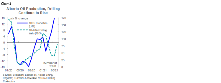 WCS is benefiting from the same demand-side factors as its light benchmark cousins, but we suspect that its discount to WTI will widen over the next year. Alberta oil production has returned to 2019 levels and, as of May 2021, was up a hefty 16% y/y in that month (chart 3), encouraged by pricing gains and assisted by the end of the provincial government’s curtailment policy as of late last year. We expect this trend to continue as the year progresses, with some additional pressure on the light-heavy discount if OPEC+ production increases improve heavy oil availability in the US Gulf Coast—the primary destination of marginal Canadian barrels. The Line 3 pipeline—construction of which is progressing well—should provide new egress capacity and a partial offset to these forces when it comes online later this year.