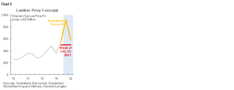 After setting record highs earlier this year, lumber prices have plunged to a range more in line with recent historical averages (chart 5). Declines look to be linked to output growth and inventory replenishment—weakness in which drove the prior price surge—while buying appears to have been supplanted by efforts to unwind product purchased earlier at higher prices. All else equal, the outlook for renovation spending is less sanguine with reopening proceeding and transfers to households set to wind down in Canada and the US. Yet, new construction activity should remain supportive for North American lumber prices—our latest forecast continues to assume that US housing starts will hit post-GFC highs in the coming year. Early data suggest that forest fires raging in BC and the Pacific Northwest have generated some modest upward price pressure as well.