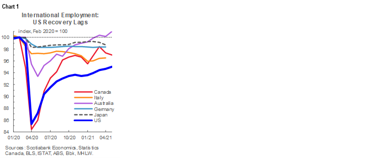 Canadian and US data for May showed the strongest inflation rate since the early 2000s; we still expect the supply side of the economy to rise enough in the coming months to ease the pace of price appreciation towards its target. Accordingly, we still believe that the Bank of Canada will lift its policy rate in Q3-2022 and that the Federal Reserve will likely begin tapering in January 2022 before raising interest rates in Q2-2023. In the interim, however, price surges via product shortages are possible. Relative US labour market weakness (chart 1) argues for extended monetary stimulus, though improvement on this front is likely.