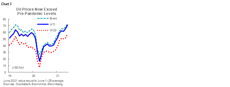 The steep climb across major crude benchmarks persisted in June as fundamentals continued to strengthen. At the time of writing, WTI and Brent were both at their highest levels since late 2018 (chart 3), having breached the 70 USD/bbl mark and averaging roughly 50% higher to date this year than for all of 2020. In the US, refinery activity continued to rise last month, as did fuel consumption—including beleaguered jet fuel as reopening progressed and with travel activity’s recovery underway. The supply side of the market is also contributing to tightness, with crude stocks in the week of June 18th at their lowest level since March 2020 and output still well below pre-pandemic levels.