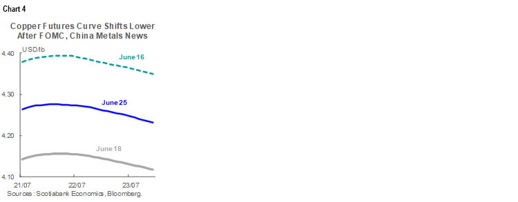 Two forces drove the price of copper’s fall from the record levels achieved in May. The first was the hawkish FOMC minutes, which bid up the US dollar and put downward pressure on values of all greenback-priced products. The second was Beijing’s announcement that it would auction off some of its strategic reserves of key base metals in an effort to cool the torrid pace of recent price gains. That hit copper—perhaps the biggest beneficiary of improving risk appetite since the peak lockdown period—hard, but drops were witnessed across industrial and agricultural commodities. The red metal’s forward curve shifted lower mid-month (chart 4). Still, copper prices remain very high relative to historical averages, and should stay supported by the global recovery this year and by battery demand plus limited output growth in the longer run.