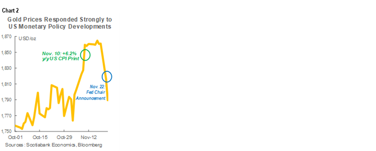 Gold prices jumped this month to temporarily exceed the 1,860 USD/oz mark for the first time since June 2021. Bullion investors are clearly responding to inflationary anxiety, as suggested by the surge in values since a stronger-than-anticipated y/y climb in the US consumer price index early this month (chart 2). Continued dovish communications from several central banks reinforced price gains, and look to have also contributed to gold’s draw as an inflation hedge. However, the yellow metal lost almost 50 USD/oz on Monday as news broke that US President Biden would keep Jerome Powell as Chair of the Federal Reserve, which markets interpreted as a hawkish signal. Still, our forecast of above-target inflation and still-low US interest rates into next year implies well-supported bullion values in 2022.
