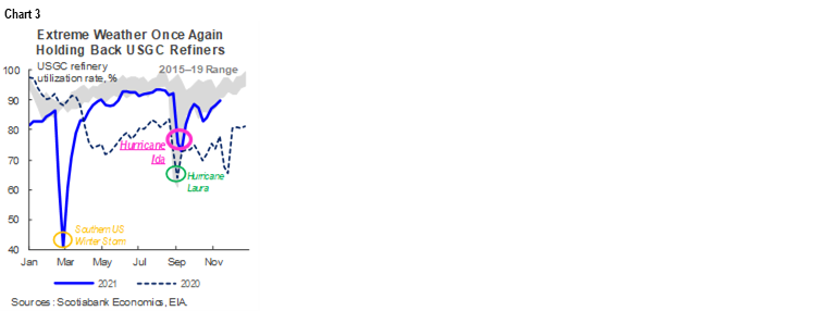 WCS’s discount to WTI is blowing out; this month it eclipsed 20 USD/bbl twice and averaged about 19 USD/bbl—the highest levels seen since before the pandemic. We highlight three drivers of the wider differential. First, as noted several times in recent months, rising OPEC+ production has increased the availability of heavy barrels in the US Gulf Coast (USGC), unwinding Western Canada’s advantage during the pandemic thus far. Alberta output is also well above pre-pandemic levels, while Saskatchewan production continues to recover. Second, USGC refinery capacity has yet to fully bounce back from shutdowns related to Hurricane Ida (chart 3, p.2), which means reduced demand for Canadian and other heavy crude for upgrade. Finally, we suspect that elevated natural gas prices are contributing to higher costs at refineries.