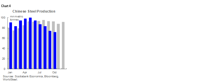 Iron ore prices continued to slide in November with Chinese steel output curbs in place, but gained towards the end of the month as news broke that steelmakers may be able to resume production. Prices closed as low as 90 USD/t this month—the lowest level since May of last year. However, data from October suggest that China was able to reduce January–October steel output versus year-earlier levels (chart 4, p.2)—quite a feat given the strong start to 2021—which leaves room to raise production in the coming months. These movements are consistent with our forecast. We had already anticipated that prices would rebound as easing Chinese restrictions increasingly contribute to higher steel production and better iron ore demand in the leadup to and after the 2022 Winter Olympics in Beijing.