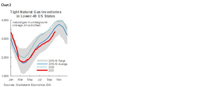 We have revised our outlook for US natural gas prices higher. Gas availability is not as limited in the US—where storage is currently about 5% below the five-year mean (chart 2, p.2)—as it is in Europe and Asia. However, the gas crunch has led to a pick up in LNG shipments and driven the Henry Hub natural gas benchmark to its highest level in almost 10 years. Still, with tight inventories and producer discipline expected to persist to some degree, we expect Henry Hub prices to peak at 5.80 USD/mn Btu in Q1 of next year and average about 4.70 USD/mn Btu for the full year. That is a 1.60 USD increase versus last quarter’s forecast for all of 2022.