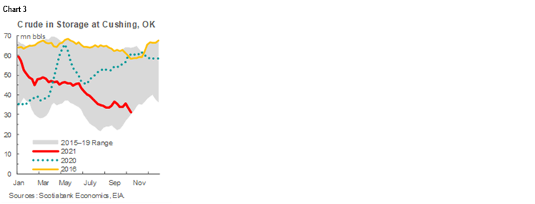 As we progress through next year, we expect positive and negative pricing developments to roughly offset for global oil benchmarks. Downward revisions to Chinese growth and industrial activity as that economy works through factors such as emissions restrictions and elevated real estate sector debt levels are clearly bearish for global crude values. More positively, we expect continued capital discipline in the US shale patch to limit output growth and keep global market balances tight; that regionally concentrated limit in investment is behind a modest forecast narrowing of the forecast Brent-WTI differential. Moreover, we no longer assume that the US and Iran will proceed with a nuclear deal—which would have brought more of the latter nation’s barrels online—this year or in H1-2022.