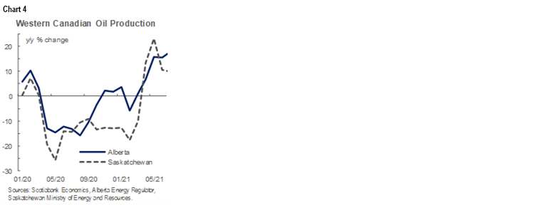 While we project that WCS prices will rise alongside their light crude counterparts, we expect the discount between the Western Canadian benchmark and WTI to widen towards 15 USD/bbl by end-2022. Key to that trajectory is our assumption that unwinding of OPEC+ production caps will increase the number of heavy sour barrels available in the US Gulf Coast—the primary destination of marginal Western Canadian crude imports—loosening the market. Our latest forecast assumes that the WTI-WCS differential will increase only to an average of just over 14 USD/bbl In the coming quarter. Added transportation capacity via the start of the Enbridge Line 3 pipeline should help to offset a wider blowout that can normally be expected in an environment of strongly rising Western Canadian crude production (chart 4) following the end of seasonal refinery turnarounds.