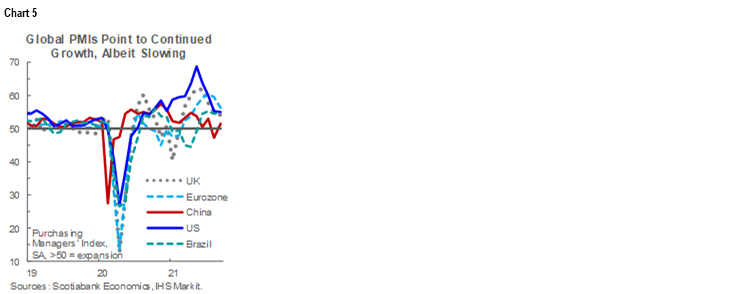 Our latest forecast update assumes that the imbalance between the demand- and supply-sides of economies around the world will prove more persistent than previously anticipated. Demand remains robust in many jurisdictions as they reopen from COVID-19 lockdowns, but production and transportation networks are increasingly unable to respond quickly enough to meet it. These pressures are acute in North America, where auto production guidance has been cut, manufacturing activity continues to weaken, and record numbers of job vacancies are being reported each month. We recently lowered our North American economic growth forecasts in light of these forces, while production curtailment to curb local emissions contributes to a softer Chinese outlook.