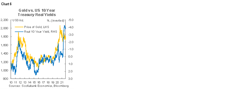 Our gold price forecast is largely unchanged at this time. We still anticipate that 2022 will be a good year for bullion pricing, and have pencilled in a historically elevated average value of 1,850 USD/oz. Values of the yellow metal tend to follow real US rates (chart 6), which should remain supportive given expectations of lingering pandemic and economic recovery uncertainty, still-accommodative US monetary policy, and stronger inflation—against which the yellow metal is seen as a hedge. We expect gold to begin to converge towards its long-run price of 1,500 USD/oz once US central bank rates begin to normalize in 2023.